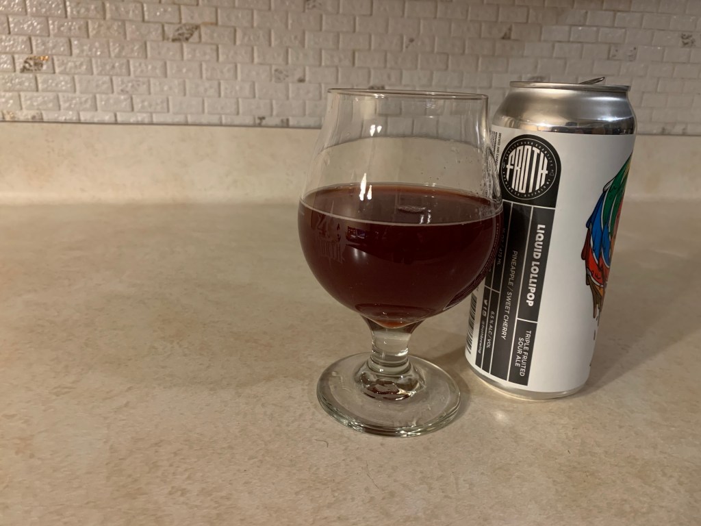 Doing a local beer tonight from Froth Brewing Co. in Buffalo! I’ve had a few of Froth’s IPAs before that I thought were alright and heard that their sours were really good and have been getting some buzz. So I’m trying the pineapple/sweet cherry variant of Liquid Lollipop.