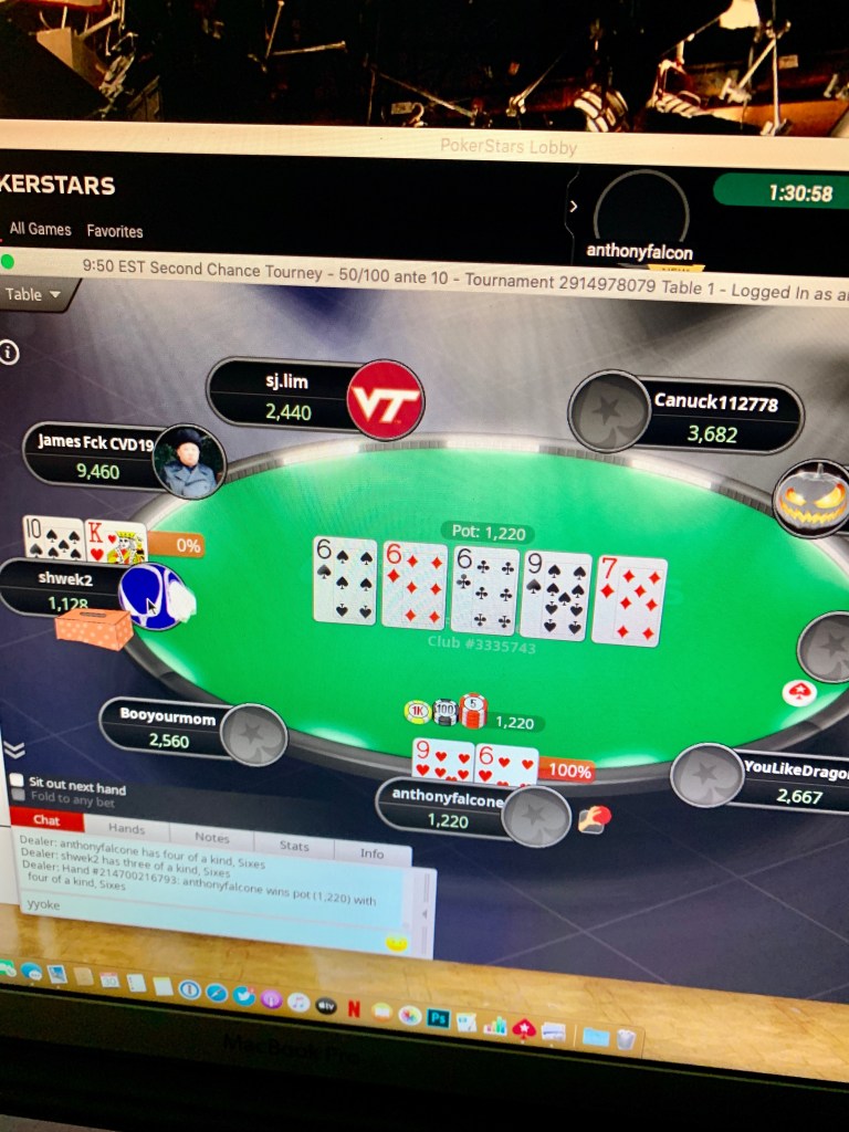 Since I haven’t been able to gamble on sports at all (which I’m used to doing every day) and haven’t been able to have my monthly poker games, I’ve been playing in private online games that one of my friends has set up on PokerStars every week to fill that gambling itch.