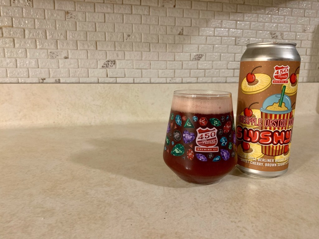 I’ve been getting a little bored of a lot of the 450 North Slushy beers that are coming out, not that they aren’t all awesome but I’ve had so many of them that a lot of them are similar. This one’s flavor stood out a good amount so I was looming forward to trying it, Pineapple Upside Down Cake.