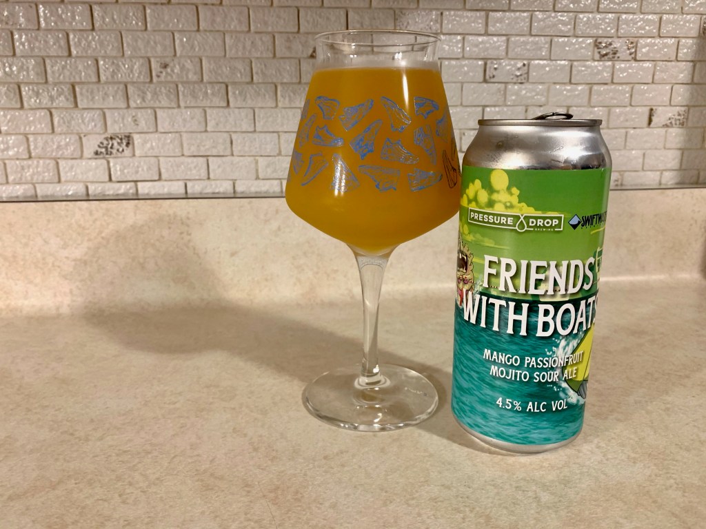 For today’s Brew Review, I have a beer that was just released locally in Buffalo a couple days ago. I saw an ad on Instagram for Pressure Drop Brewing’s new collab sour with Swiftwater Brewing, Friends with Boats. I’ve been to the Pressure Drop brewery and had some Swiftwater beers before and was interested in trying a mango passionfruit mojito flavored beer. The best boats are the ones your friends own.