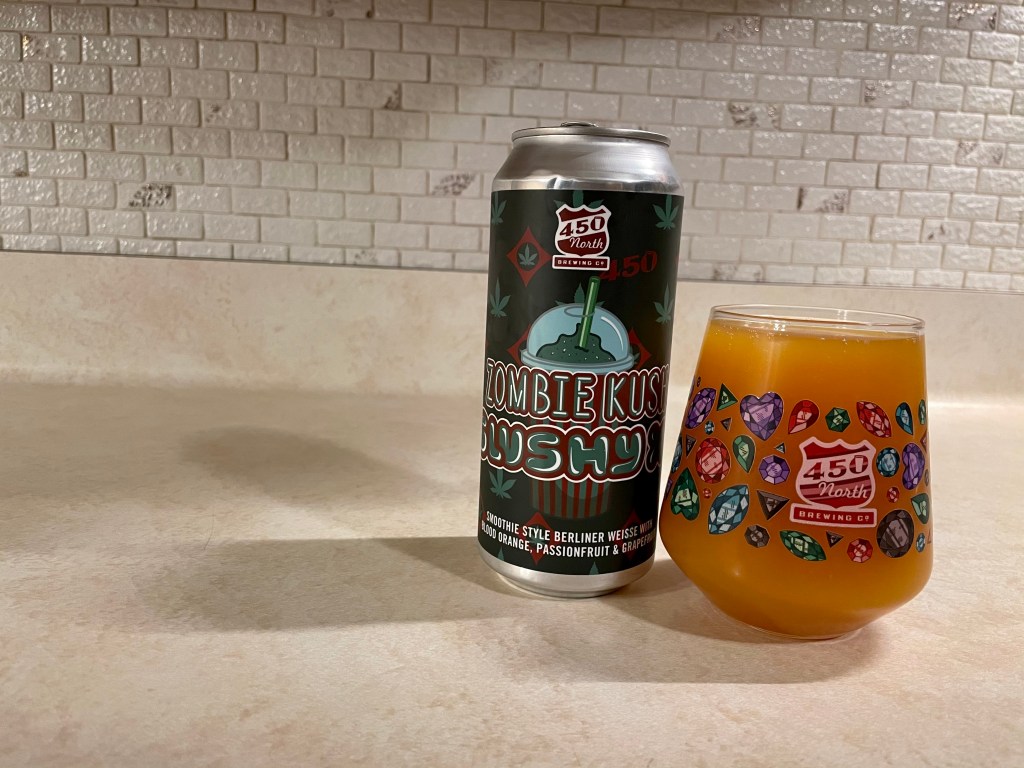 On today’s Brew Review I’m having 450 North’s Slushy XL Zombie Kush from their Halloween release. This one was a tropical 5.62% sour loaded with blood orange, passionfruit and grapefruit.