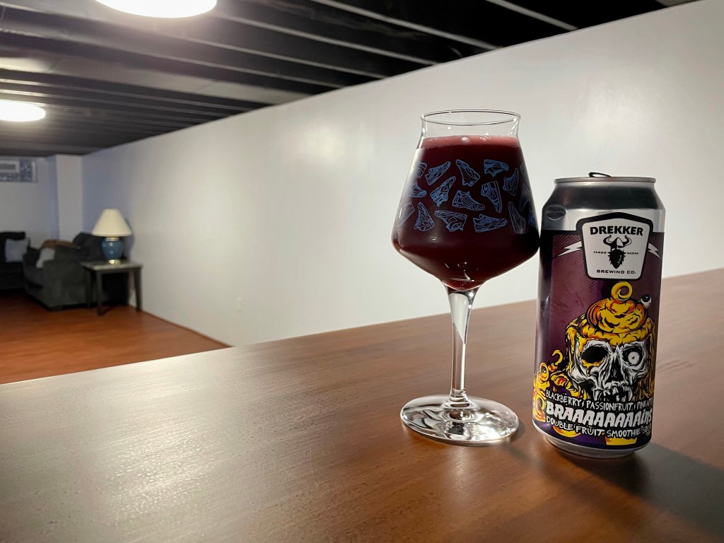 I’m drinking my second Braaaaaaaains double fruit smoothie sour from Drekker Brewing Company in Fargo, ND for today’s Brew Review. This Blackberry/Passionfruit/Pineapple variant is an ale with blackberry, passionfruit, pineapple, salt, lactose and vanilla.