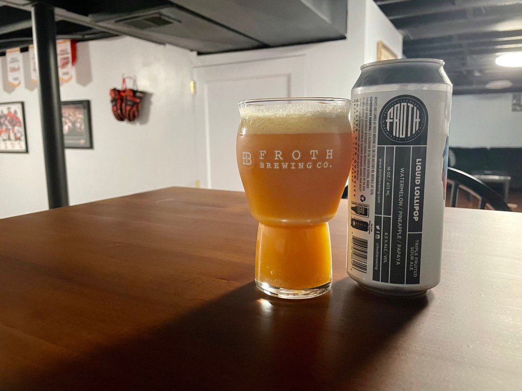 I’m having one of the latest Liquid Lollipops from Froth for tonight’s Brew Review. This watermelon, pineapple, papaya version of the 6.5% triple fruited sour series is a great combo of summer flavors.