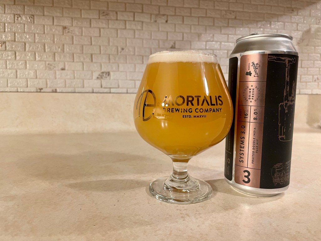 On today’s Brew Review, I’m having Systems 3.0, an 8% fruited double IPA that Mortalis brewed in collaboration with Fidens in Albany, NY and Widowmaker in Boston, MA. A soft full base was hopped with Lupomax, Citra and Mosaic and then conditioned on pineapple.