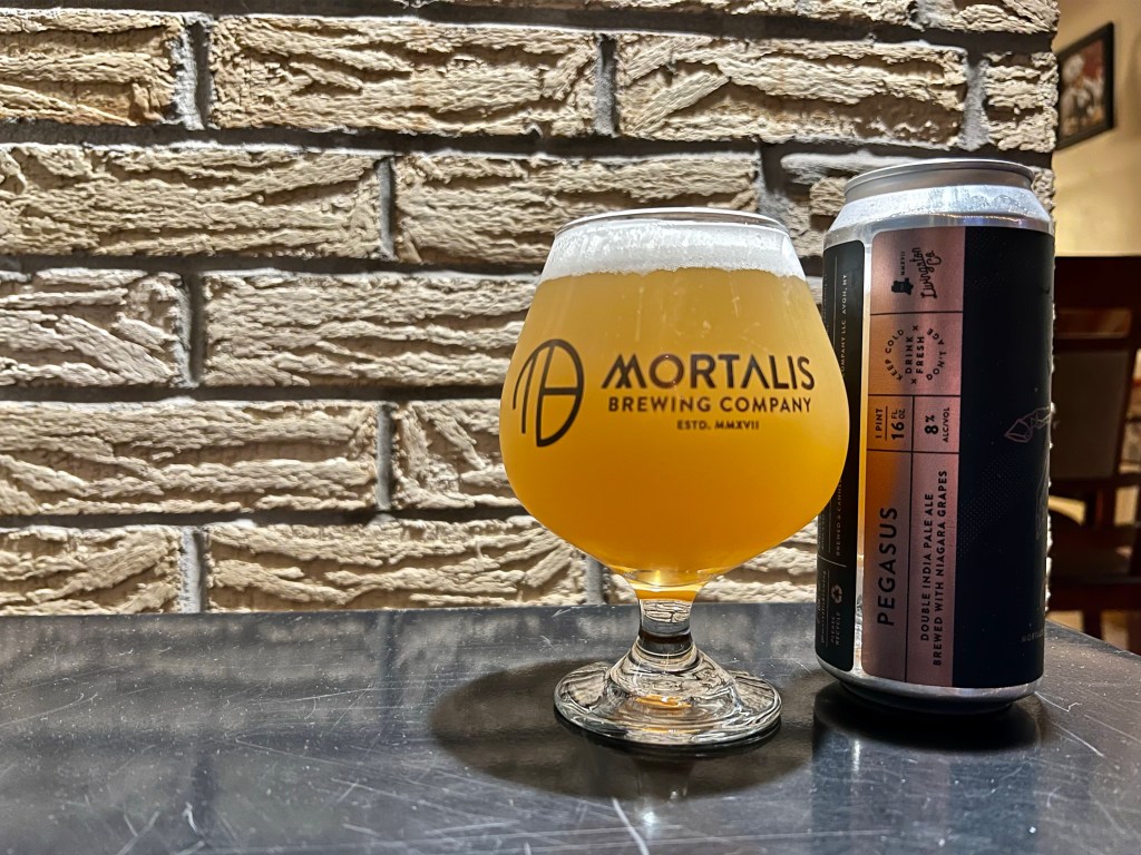 On today’s Brew Review, I’m having Pegasus, released this week from Mortalis. This 8% double IPA is made with Nelson and Galaxy hops and conditioned on fresh white Niagara grape juice.