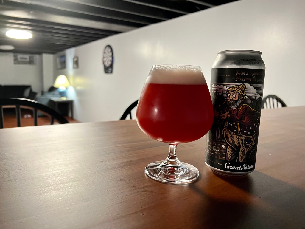 I wasn’t thrilled with the first two beers I had from Great Notion in Portland, OR but this one, Double Raspberry Marshmallow Shake that I’m having for today’s Brew Review impressed me. This high ABV, 9% tart ale is made with raspberry and natural and artificial flavors.