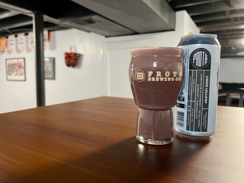 On today’s Brew Review, finally having a new Froth Liquid Lollipop. This version of the 6.5% triple fruited sour is based on the bomb pop and flavored on blue raspberry, meyer lemon, raspberry and marshmallow.