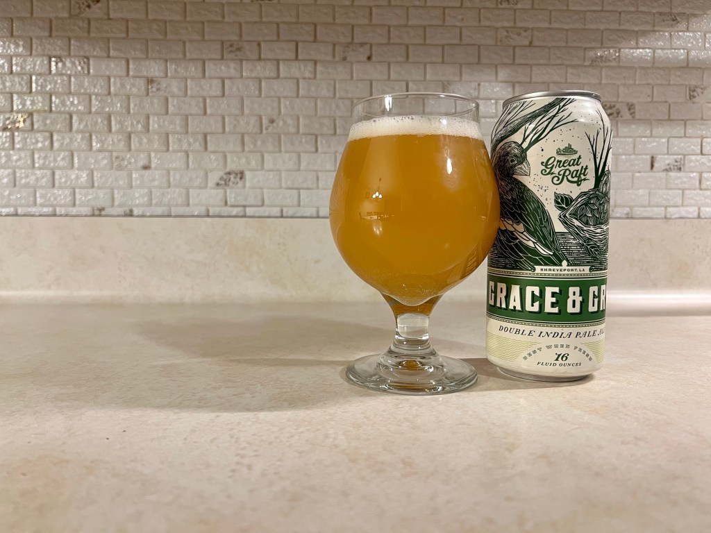 On tonight’s Brew Review, I’m having the last of the beers my buddy sent me from Louisiana, Grace & Grit from Great Raft Brewing. This 8% New England double IPA was brewed with Citra and Amarillo hops.
