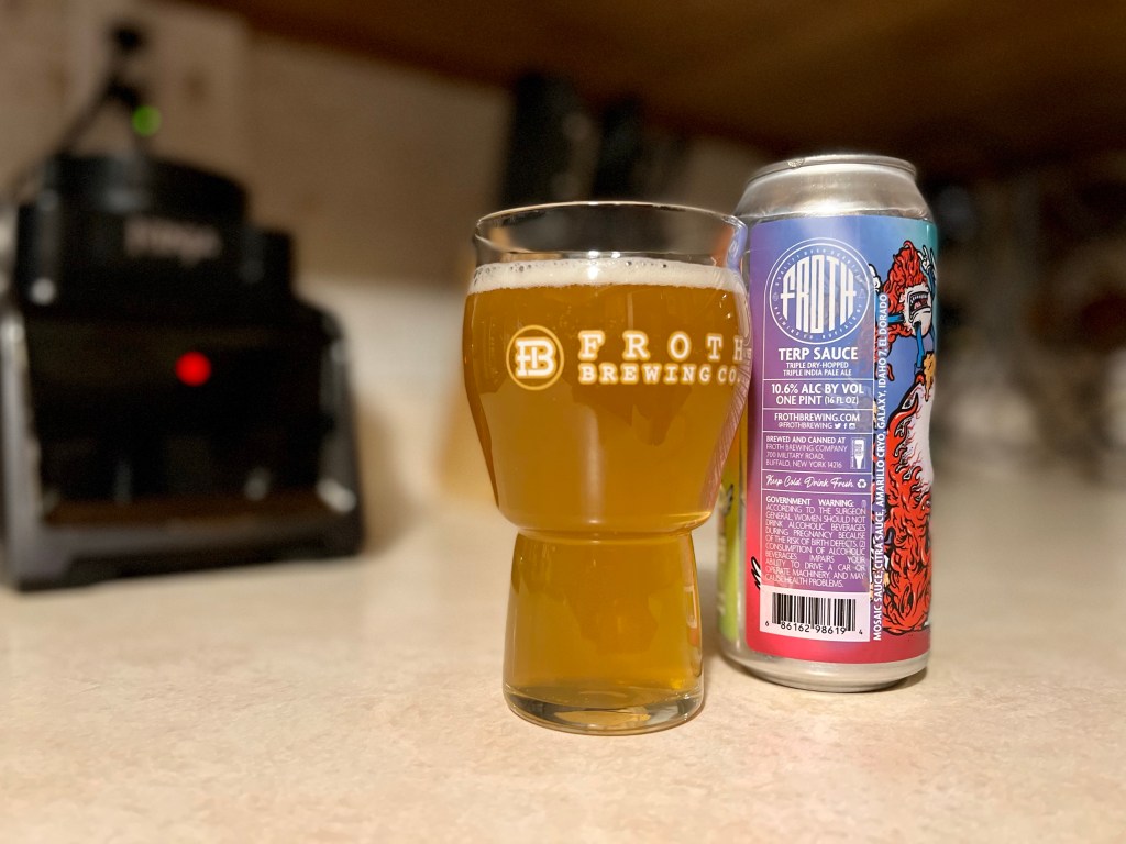 I typically don’t get Froth IPAs to go and just have them on tap when I go pick up their sours but this one was out of the box enough that I had to try it out. Terp Sauce is a 10.6% triple dry-hopped triple IPA brewed with Mosaic sauce and Citra sauce (experimental, highly refined and concentrated form of hop oil), Amarillo Cryo, Galaxy, Idaho 7 and El Dorado.