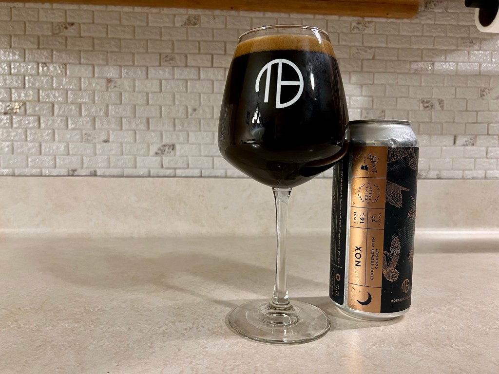 I like the concept for today’s Brew Review of Nox from Mortalis. This 7% stout brewed with coconut is a smaller and lighter version of the coconut version of their popular Nyx imperial stout. It’s always nice to have a lighter stout.
