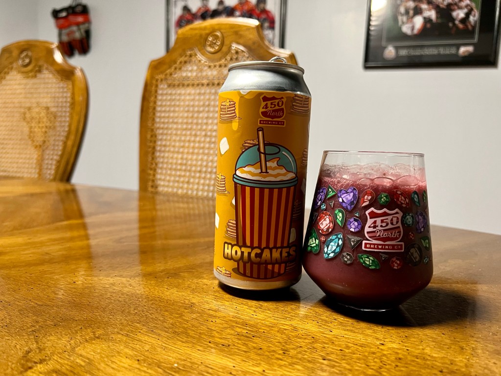On tonight’s Brew Review that I forgot to post earlier, I’m having 450 North’s Hotcakes version of Slushmallow. This 5.3% sour ale is conditioned with blueberry, blackberry, maple syrup, marshmallow and banana.