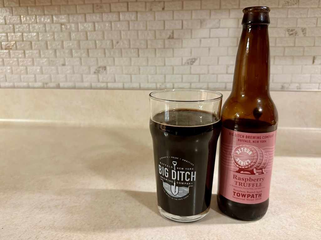 A few weeks ago, I tried Big Ditch’s 2018 version of their Towpath 10.3% bourbon barrel aged imperial stout. They did several variants of that stout for their Detour Series and on today’s Brew Review, I’m trying the raspberry truffle version made with raspberries, cacao nibs and milk sugar.