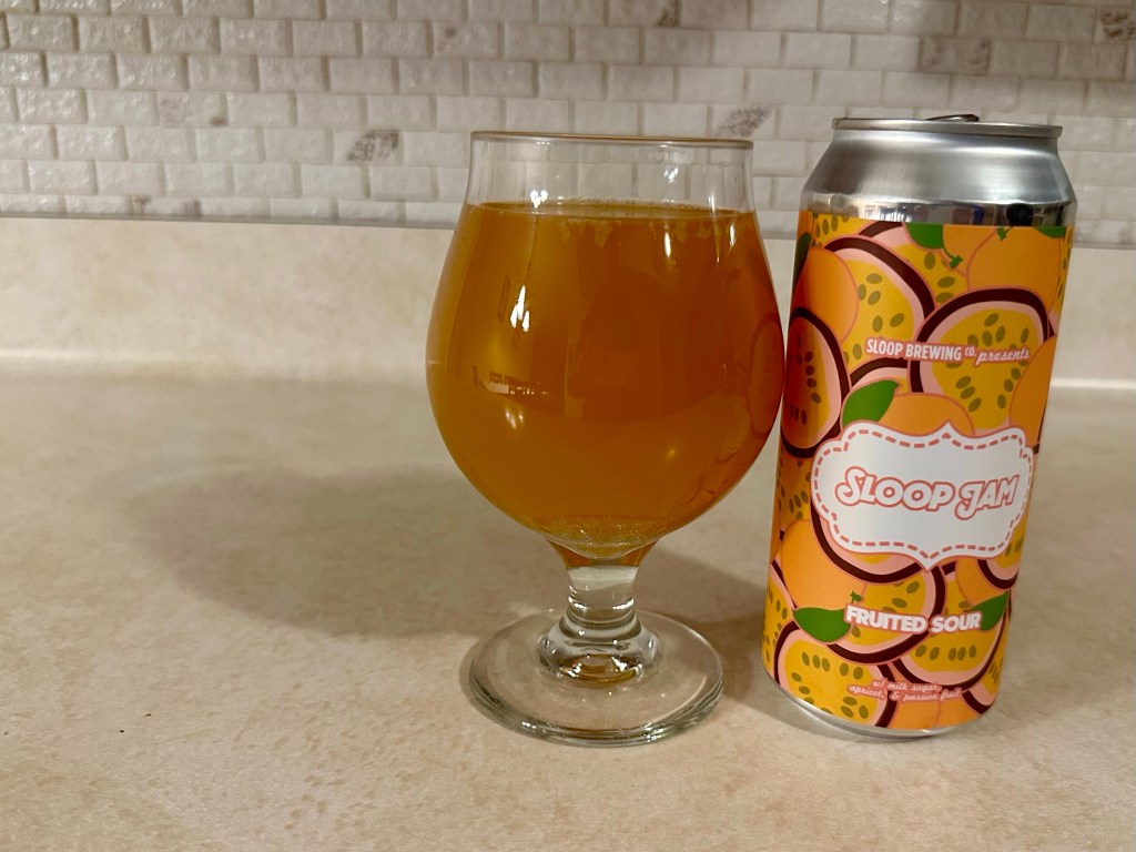 I’ve only ever had IPAs from Sloop Brewing and on today’s Brew Review I’m trying my first sour from them, their apricot and passionfruit version of their Sloop Jam Fruited Sour. This 5% fruited sour ale was brewed with milk sugar, apricot and passionfruit.
