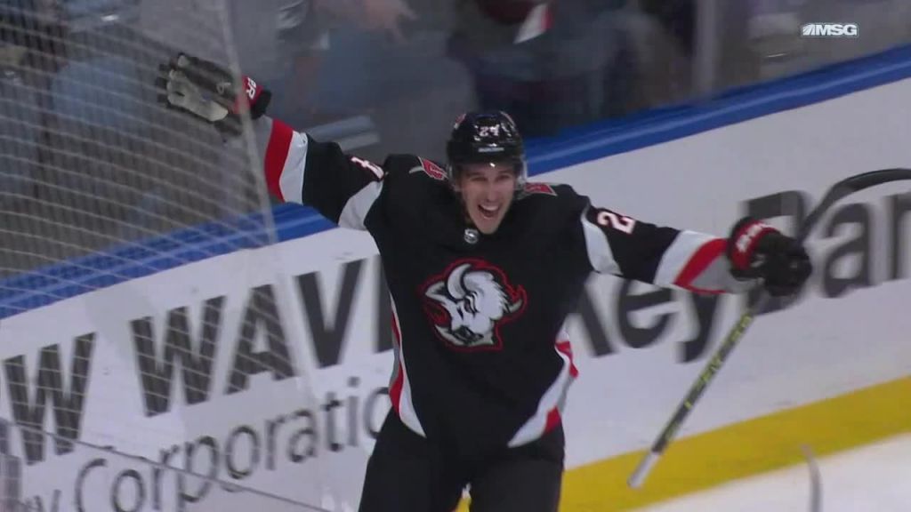 Hat trick Dylan Cozens! With 8:08 left in the game, Cozens scored his first hat trick of his career with a nice forehand backhand right in front of the net after a beauty tape to tape pass from Vinnie Hinostroza after good work from Mittelstadt down low with the puck.
