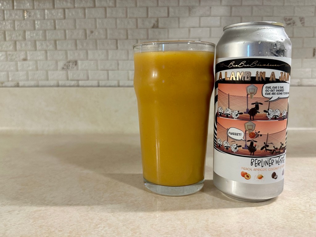 Shipped up from down in Texas, on tonight’s Brew Review I’m having the peach, apricot, coconut, and fluff variant of Baa Baa Brewhouse’s Lamb in a Jam series of fruited berliner weisse sours.