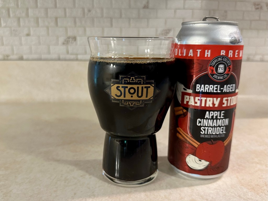 I was a bit surprised with today’s Brew Review as I tried the Apple Cinnamon Strudel version of Toppling Goliath Brewing Co. in Decorah, Iowa’s Barrel-Aged Pastry Stout. This heavy 15% stout with cinnamon-spiced apple flavors meets the flavors of a latte with lactose and was aged in bourbon barrels.