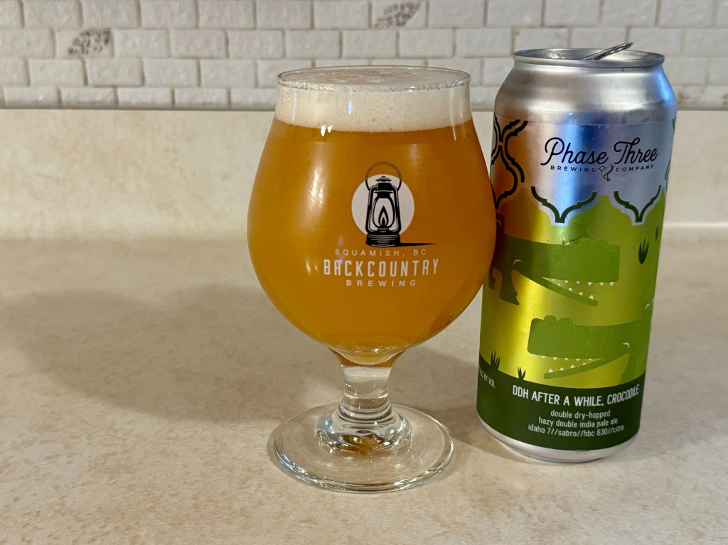 After taking the weekend off doing one of these, I’m back tonight with my Brew Review of DDH After a While, Crocodile from Phase Three Brewing in Chicago. This 7.8% double dry-hopped hazy double IPA was brewed with Idaho 7, Sabro, HBC 630, and Citra hops.