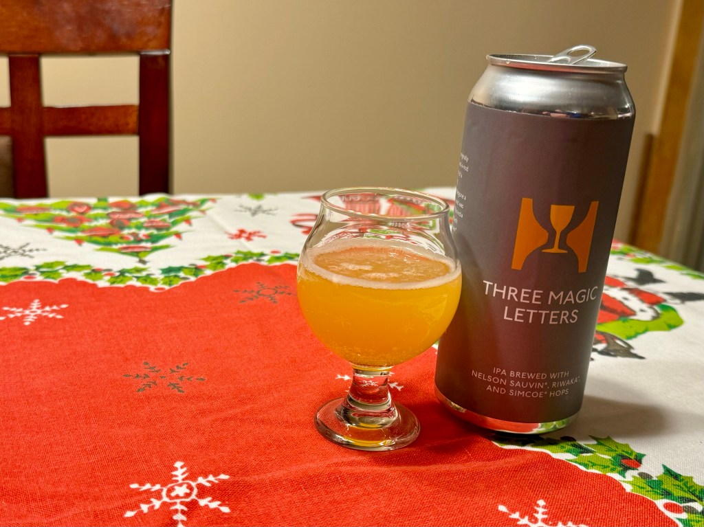 On tonight’s Brew Review, I’m tryout out Three Magic Letters from Hill Farmstead. This 6.2% American IPA (those three magic letters) was brewed with Nelson Sauvin, Riwaka, and Simcoe hops.
