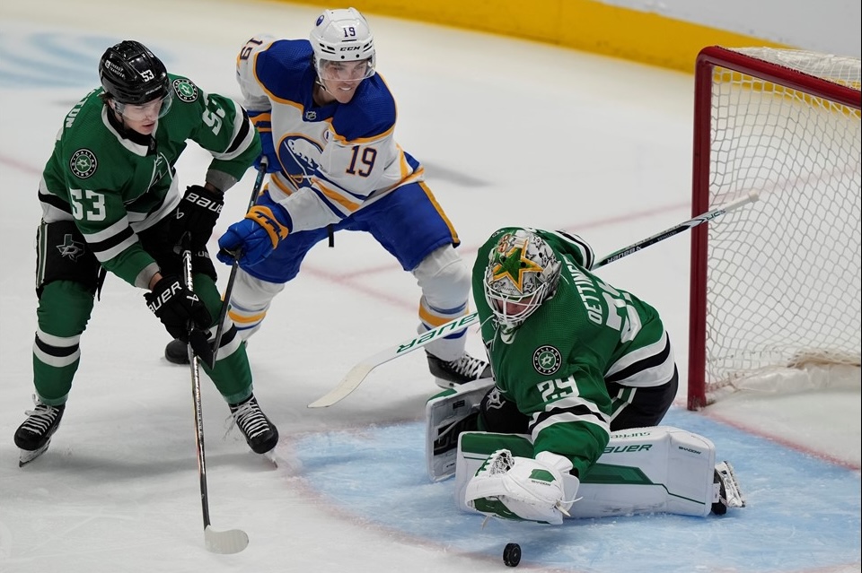 The Sabres got the first goal of the game, 4:09 into it as Henri Jokiharu’s one timer from the blue line deflected off Alex Tuch and into the back of the net to make it 1-0 Buffalo. Jason Robertson answered right back for Dallas though to tie it up with a beautiful tip from Roope Hintz past UPL with 13:45 left in the first. Just 44 seconds later they took the lead though with Mason Marchment tipping it a long range screened shot from the point to go up 2-1 on a play that really looked like it was a high stick. After review on a really close play, the Sabres caught a break and it was determined to not be a goal. A few minutes after that with 10:22 left in the first, Rasmus Dahlin picked up his 20th goal of the season, the first time a defenseman has scored 20 goals for Buffalo since 1990, on a shot that snuck past Oettinger’s five hole to put the Sabres up 2-1 instead. Not a terrible period for Buffalo. The Stars outshot us 7-5, but we capitalized twice on those limited chances and UPL was solid to keep it that way.