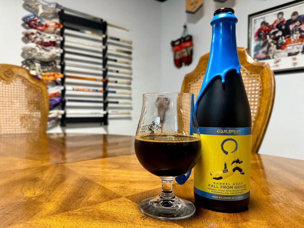 I almost forgot to post one today, but on tonight’s late night Brew Review, I’m having Barrel Aged Fall From Grace from Equilibrium in collaboration with Civil Society. This 17% imperial stout was aged 24 months in Willett Barrels with peanuts butter, marshmallow, and bananas added.