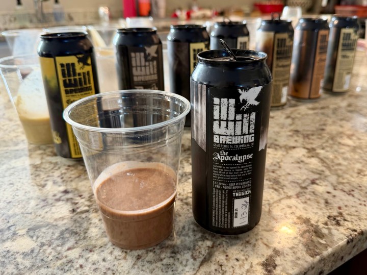 Really interesting concept from Ill Will, where they did a bunch of cans of individual flavors with the idea to make your own cuvees of them. On today’s Brew Review, I’m having The Apocalypse, which combines all those flavors – coconut, peanut butter, caramel, dark and milk chocolate, nougat, and shortbread into one 5.5% barrel aged smoothie.